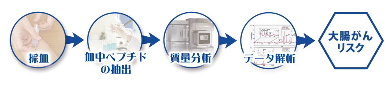 消化器がんの中でも死亡者数ワースト1位である大腸がんのリスクを調べる血液検査です。一回の採血で、早期を含む大腸がんのリスクが確認できます。検査では4種類のペプチドを測定し、「がんに近い状態」かどうかをリスク評価として算出いたします。リスクは評価A(低リスク群)、B(中リスク群)、C(高リスク群)の三段階で判定します。京都府立医科大学附属病院の 研究成果からは感度82%・特異度93%と、高い精度を示すことが報告されています。