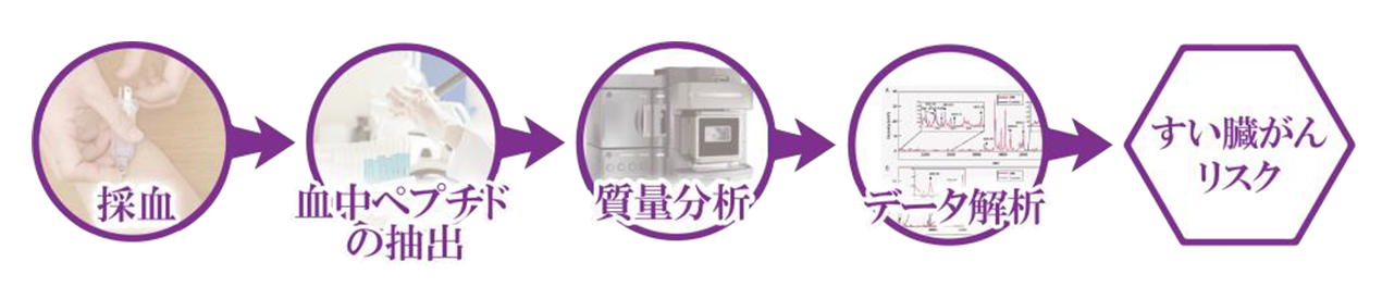 がんの中でも“最悪のがん”として知られているすい臓がんのリスクを調べる検査です。すい臓がんは自覚症状が少なく早期発見が難しい上に、進行が早いために重症化してしまうケースが多いとされています。従来健診などで行われる腫瘍マーカーでは早期がんの発見は困難でしたが、本検査では一回の採血で、早期を含むすい臓がんのリスクが確認できます。検査では4種類のペプチドを測定し、「がんに近い状態」かどうかをリスク評価として算出いたします。リスクは評価A(低リスク群)、B(中リスク群)、C(高リスク群)の三段階で判定します。富山大学附属病院の研究成果からは感度84%、特異度93.4%と、高い精度を示すことが報告されています。
